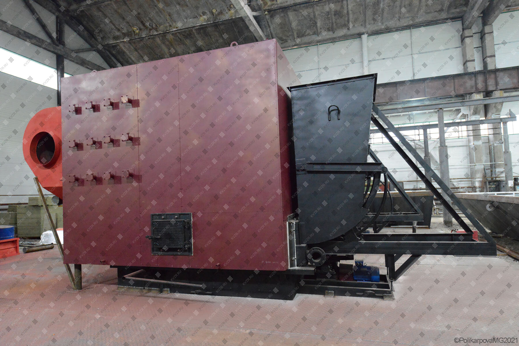 Данные модели поставляются двумя блоками - топочный блок, механический забрасыватель и топка с опрокидывающими колосниками. Топливо в бункер забрасывателя подает скребковый транспортер топливоподачи или ленточный транспортер топливоподачи. На фронте установлена плита для крепления забрасывателя, на фронте и на боковой стенке котла установлены дверки для обслуживания топки и контроля процесса горения. Сброс шлака в канал золошлакоудаления происходит через проем, образующийся на топке при повороте опрокидывающихся колосников.