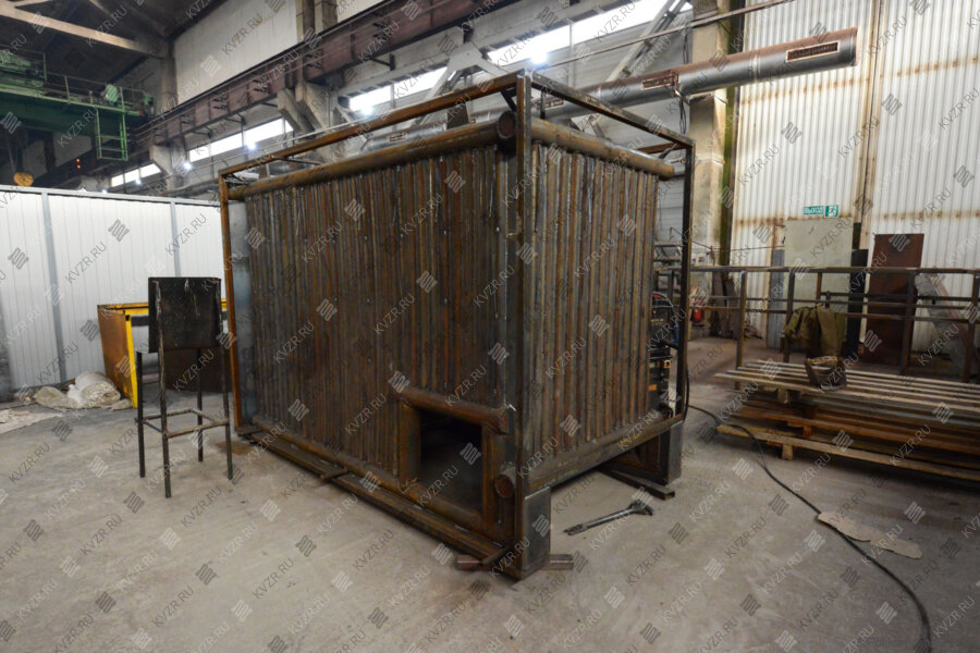 Блок водонагревательного котла КВм 0,6 МВт представляет собой горизонтальную стальную сварную конструкцию, состоящую из трубной системы (радиационной и конвективной поверхности нагрева), опорной рамы и каркаса с теплоизоляционными материалами, обшитого листовой сталью. Топочная камера состоит из труб Ø 57x3,5 мм. Конвективная поверхность нагрева состоит из пакетов выполненных из труб Ø 32x3 мм, для интенсификации теплообмена трубы пакетов расположены в шахматном порядке.
