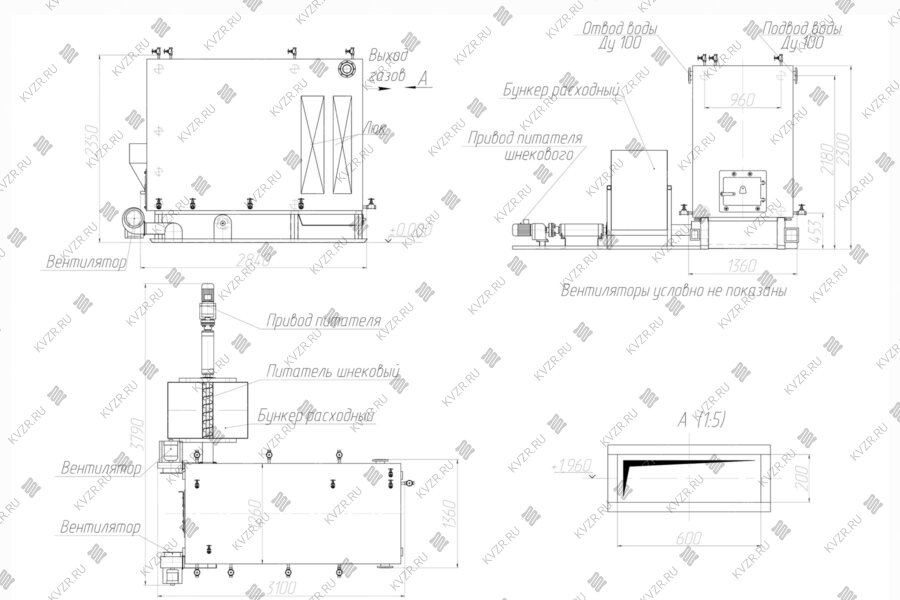 Конструкция котла на биомассе с вихревой топкой состоит из бункера, шнекового питателя, вихревой топки, котельного блока с конвективными пакетами.