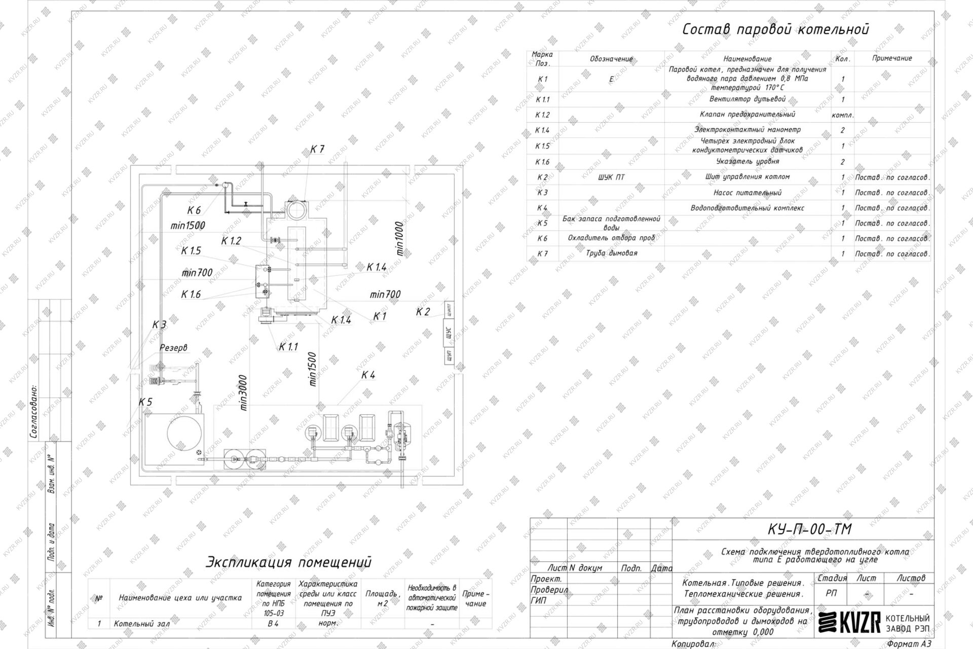 Чтобы правильно подключить твердотопливный паровой котел 1600 кг / 1.6 т пара -170°С -0,9 МПа / 9 кгс/cм² в котельной необходимо оставить проемы для обслуживания оборудования во время эксплуатации. На представленной здесь схеме обозначены их размеры. Кроме того, в данной примерной схеме монтажа паровых котлов и оборудования указан перечень минимально необходимого вспомогательного оборудования.